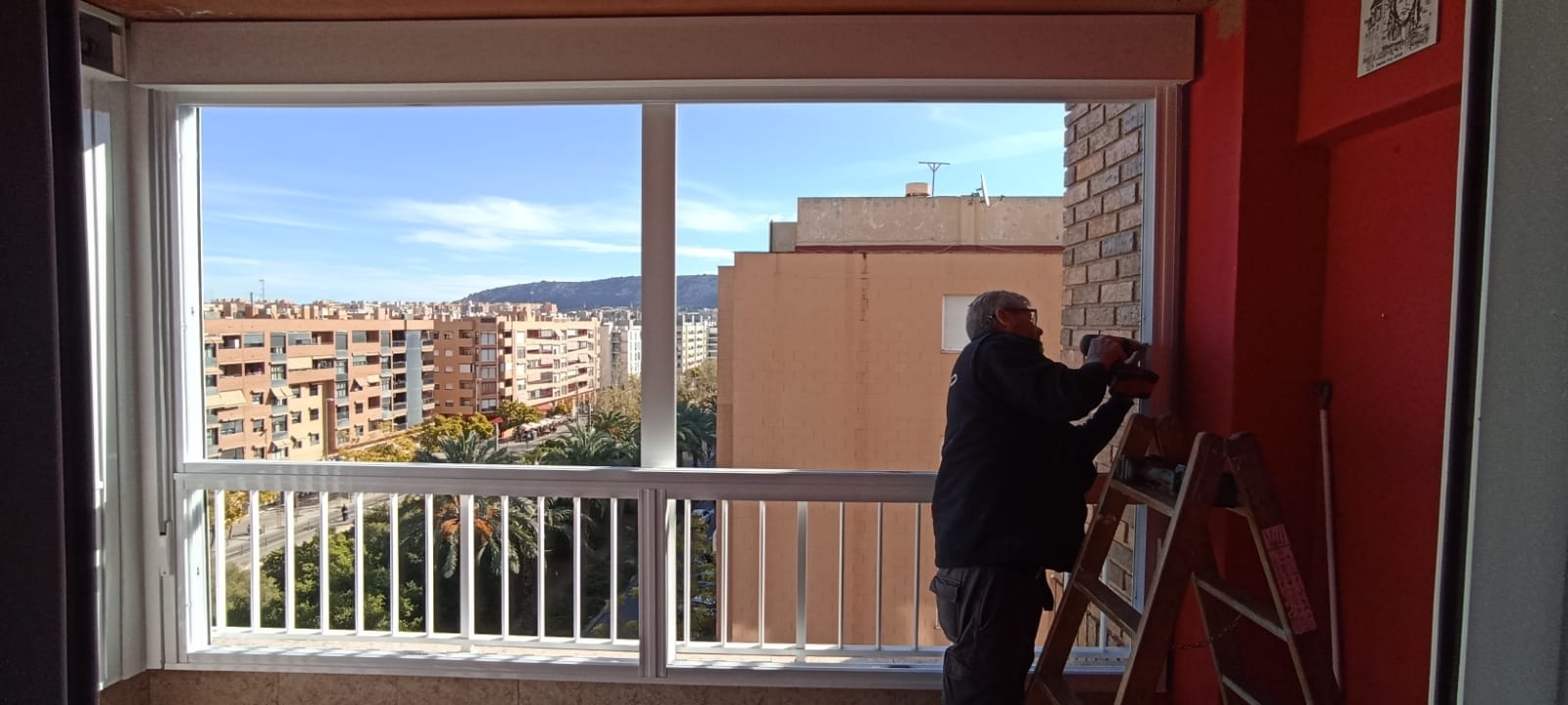 Este tipo de cerramientos con persianas es ideal para balcones o terrazas en zonas como Alicante, donde el clima soleado requiere sistemas versátiles y duraderos.